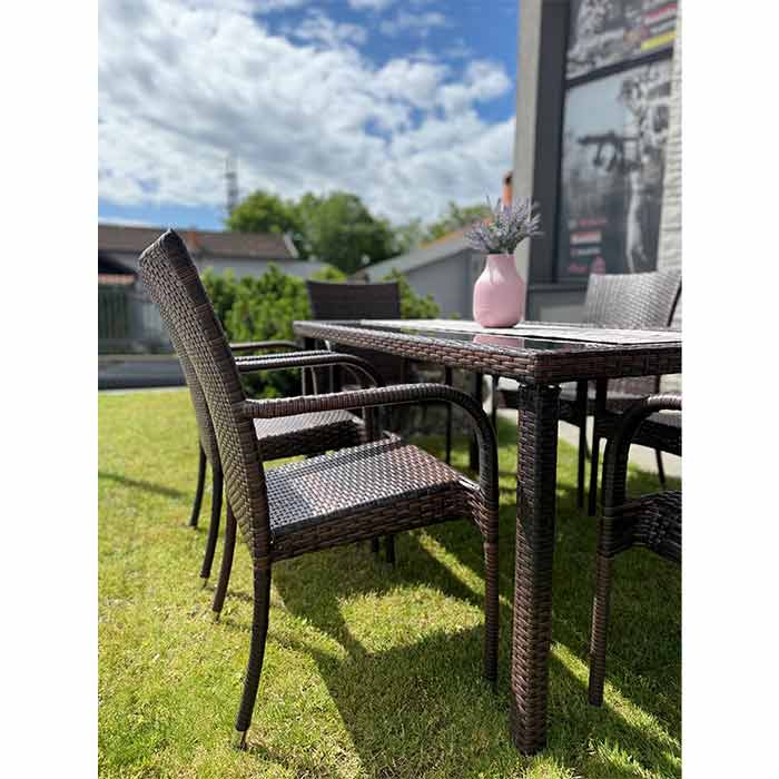 - Izdržljivost i elegancija imitacije ratana: Izrađen od visokokvalitetne plastike, imitacije ratana u privlačnoj braon boji, ovaj set nudi vizuelnu lepotu prirodnog ratana, uz znatno veću otpornost na spoljne uslove. Materijal je otporan na UV zrake, kišu i promene temperature, što garantuje dugovečnost i minimalno održavanje.