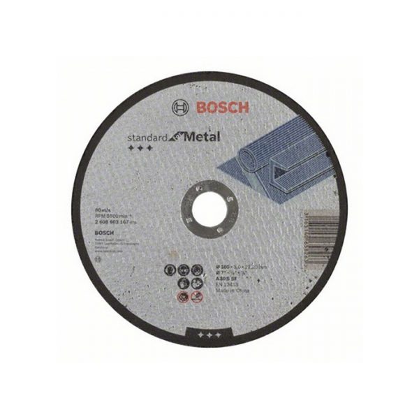Bosch rezna ploča ravna standard za metal  2 608 603 167. Specifikacija: A 30 S BF. Prečnik 180mm, unutrašnji prečnik 22.23mm, debljina 3mm.