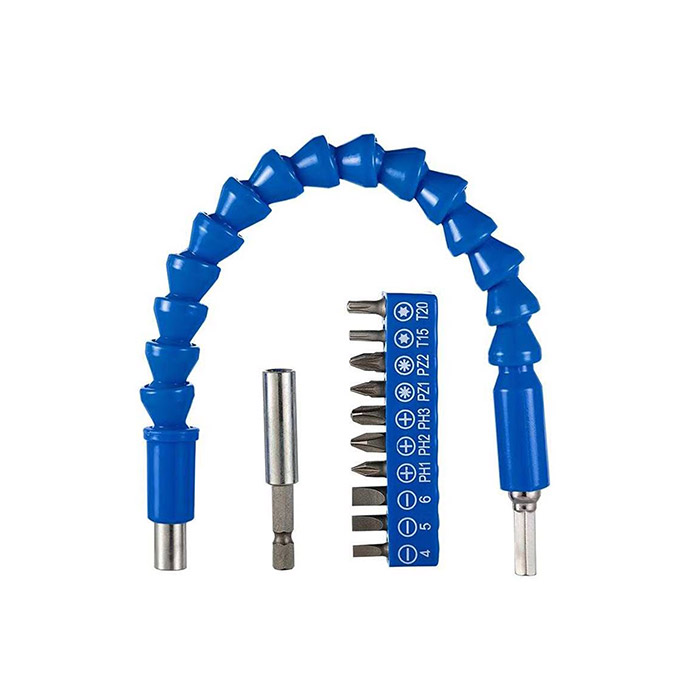 - Fleksibilni produžetak: Sa segmentiranim zglobnim telom koje omogućava savijanje i zadržavanje željenog ugla, čime se olakšava rad u nepristupačnim uglovima. Na oba kraja ima šestougaone prihvate za bitove i držače.