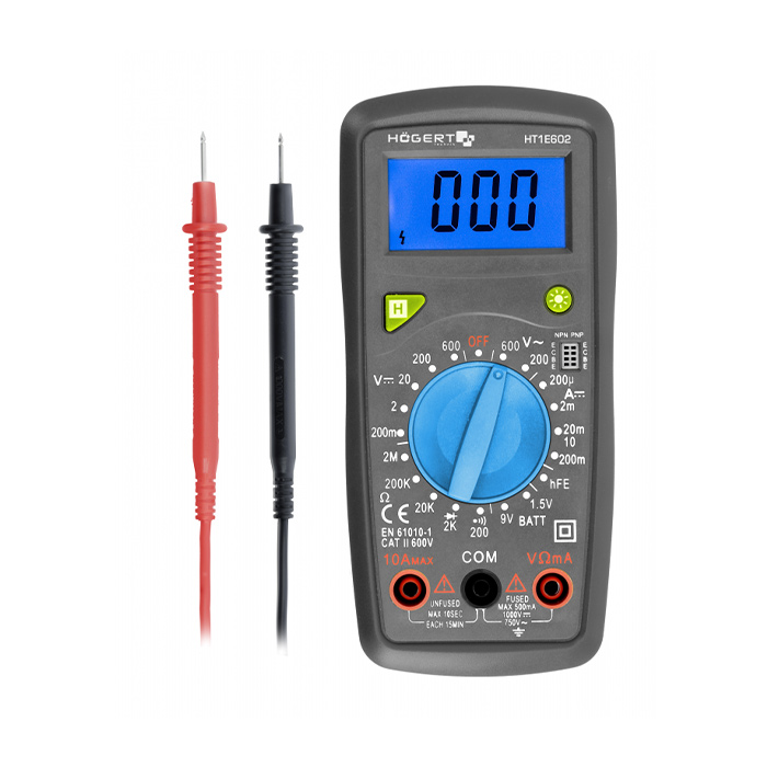 - multimetar meri istosmerni napon do 600 V i izmenični napon do 600 V, jednosmernu struju do 10 A i otpor do 2 MΩ, vrši testove dioda i kontinuiteta i testove baterija sa 1,5 / 9 V;