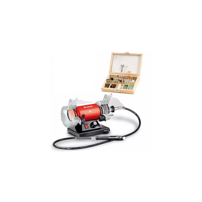 Einhell Stoni Uredjaj za Brusenje/Graviranje TH-XG 75 može odraditi i poslove rezanja zahvaljujući priboru od 100 nastavaka koji dolazi u drvenoj kutiji. To su nastavci za fleksibilnu osovinu koja se priključuje bočno i omogućavaju vrlo precizan rad. Nožice su gumirane kako bi se smanjile vibracije. Brzinu je moguće ručno podesiti. TH-XG 75 brusilica ima ugrađene štitnike za oči.
