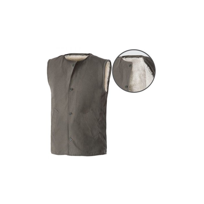 Prsluk od izdržljivog ceradnog platna sa postavom od prirodnog krzna, sivomaslinaste boje, domaća proizvodnja. Dostupne veličina 50-60.