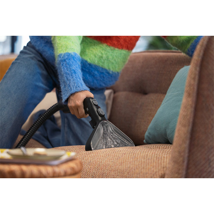 Dubinsko čišćenje i kompaktan dizajn sa funkcijom raspršivanja i ekstrakcije je snažno i energetski efikasno rešenje za čišćenje tekstilnih površina. Zahvaljujući kompaktnom dizajnu, uređaj se može lako skladištiti uz uštedu prostora i brzo je spreman za upotrebu kada god je potrebno temeljno i praktično čišćenje u dubinu vlakana. Prljavština se brzo i efikasno uklanja sa tapaciranog nameštaja i tepiha. Fleksibilno usisno crevo i dugačak kabl omogućavaju visok nivo udobnosti, fleksibilnosti i slobode kretanja. Inovativna XXL 2 u 1 papuča za raspršivanje i ekstrakciju, u kombinaciji sa produžnim cevima, omogućava udobno čišćenje srednje velikih tepiha u uspravnom položaju. Kada se koristi direktno na ručki, papuča može očistiti veće mekane površine dvostruko brže u poređenju sa standardnim papučama za pranje tapaciranog nameštaja. Zahvaljujući praktičnim opcijama skladištenja na uređaju, svi dodaci su uvek pri ruci.