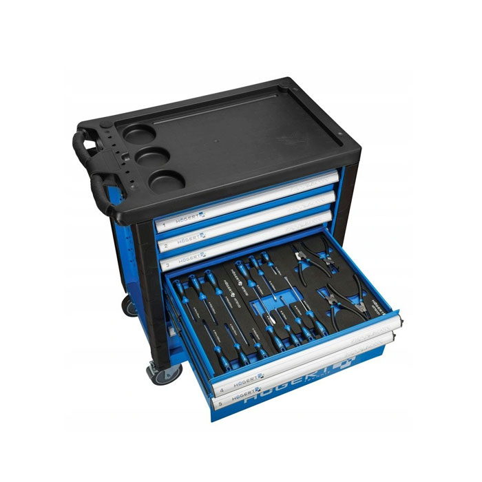 Kolica sa alatom HT7G056 imaju 6 fioka na izvlačenje -4 fioke visine 75mm i 2 fioke visoke 154mm. Alat koji se dobija uz kolica, je uredno raspoređen u 5 fioka